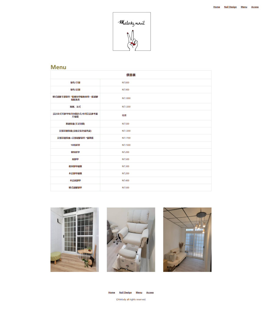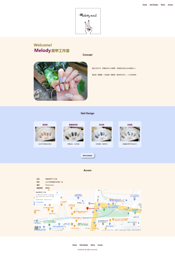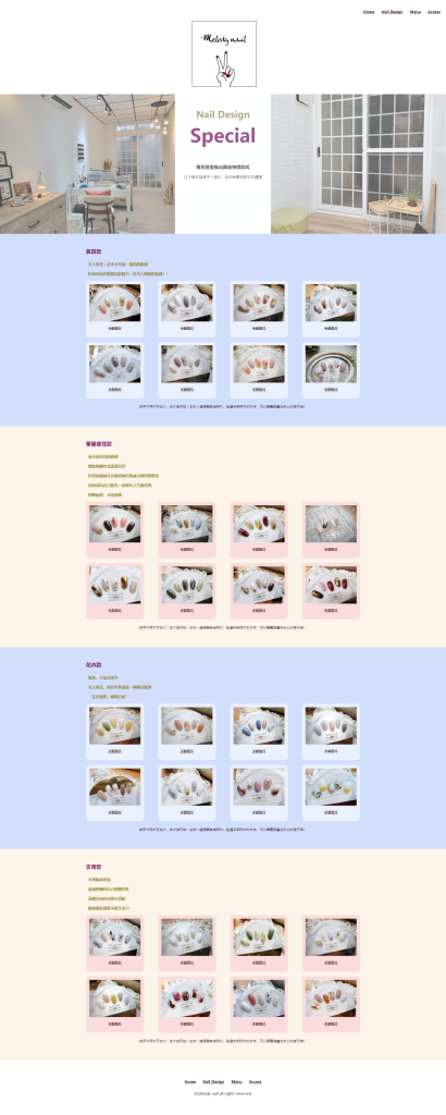 概要・目的:台湾に実在する個人経営のネイルサロンのホームページです。2023年8月の引っ越しに合わせ、今までなかったウェブサイトを開設し、新規のお客様を増やしたいと考えています。Nail Designのページにてスタイルの異なる7種類のデザインを紹介し、実際のネイル写真を載せました。(クリックすると大きく表示)皆様に自分に合ったネイルデザインを見つけられたらいいです。