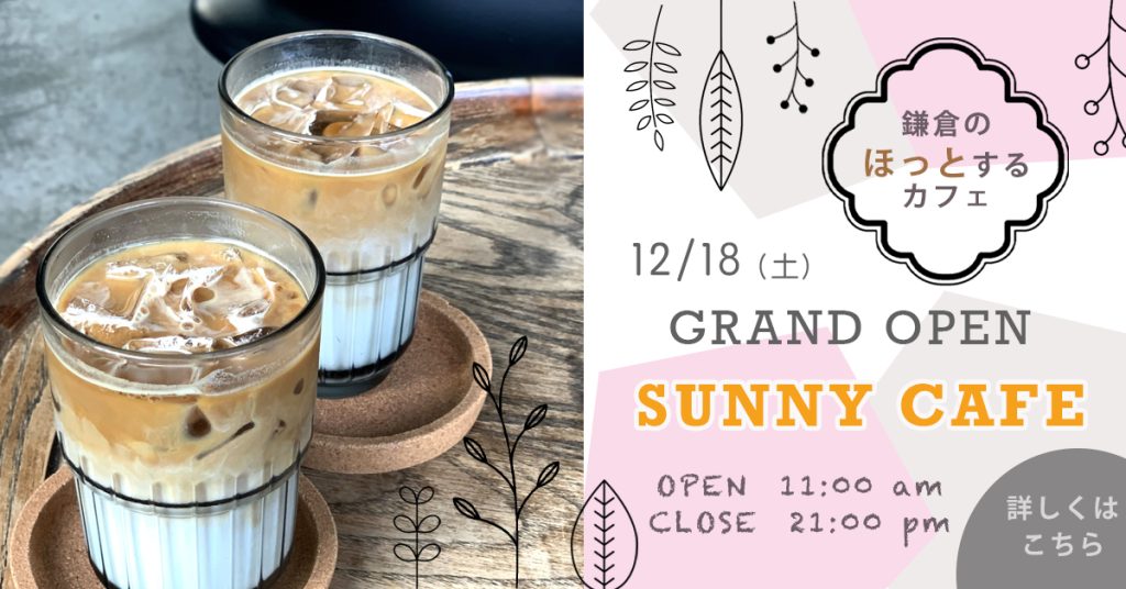 Sunny Cafe grand open サイズ:300x250 制作ツール:photoshop テーマ:Sunny Cafe GRAND OPEN(架空のお店) ターゲット:カップル、友達同士 概要・目的:鎌倉の古民家をリフォームし、おしゃれなカフェに変身した「Sunny Cafe」12月18日(土)にグランドオープンします。地元の方、観光客、コーヒー好きな方がホッと一息つける空間になっているので、沢山の方に来ていただきたいです。オープンの情報をお知らせするバナーです。 1200x628